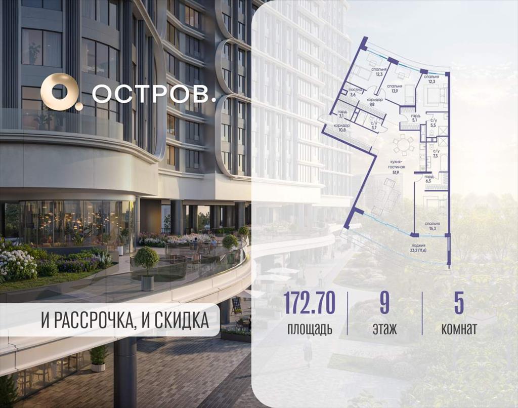 | Продаётся квартира от застройщика: общая площадь 172.70 м, жилая 53.80 м, кухня 51.90 м, 9-й этаж, жилой квартал «Остров 7», корпус 3 (секция 2) . Срок сдачи: 1 квартал 2028 года.