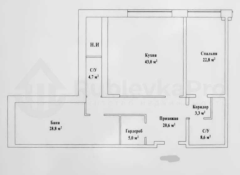 общая 136,8 м2, жилая 0 м2, кухни 43 м2 |