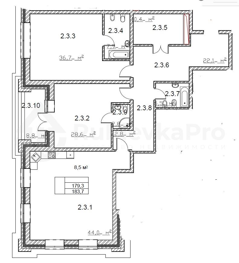 общая 182 м2, жилая 0 м2, кухни 44 м2 |