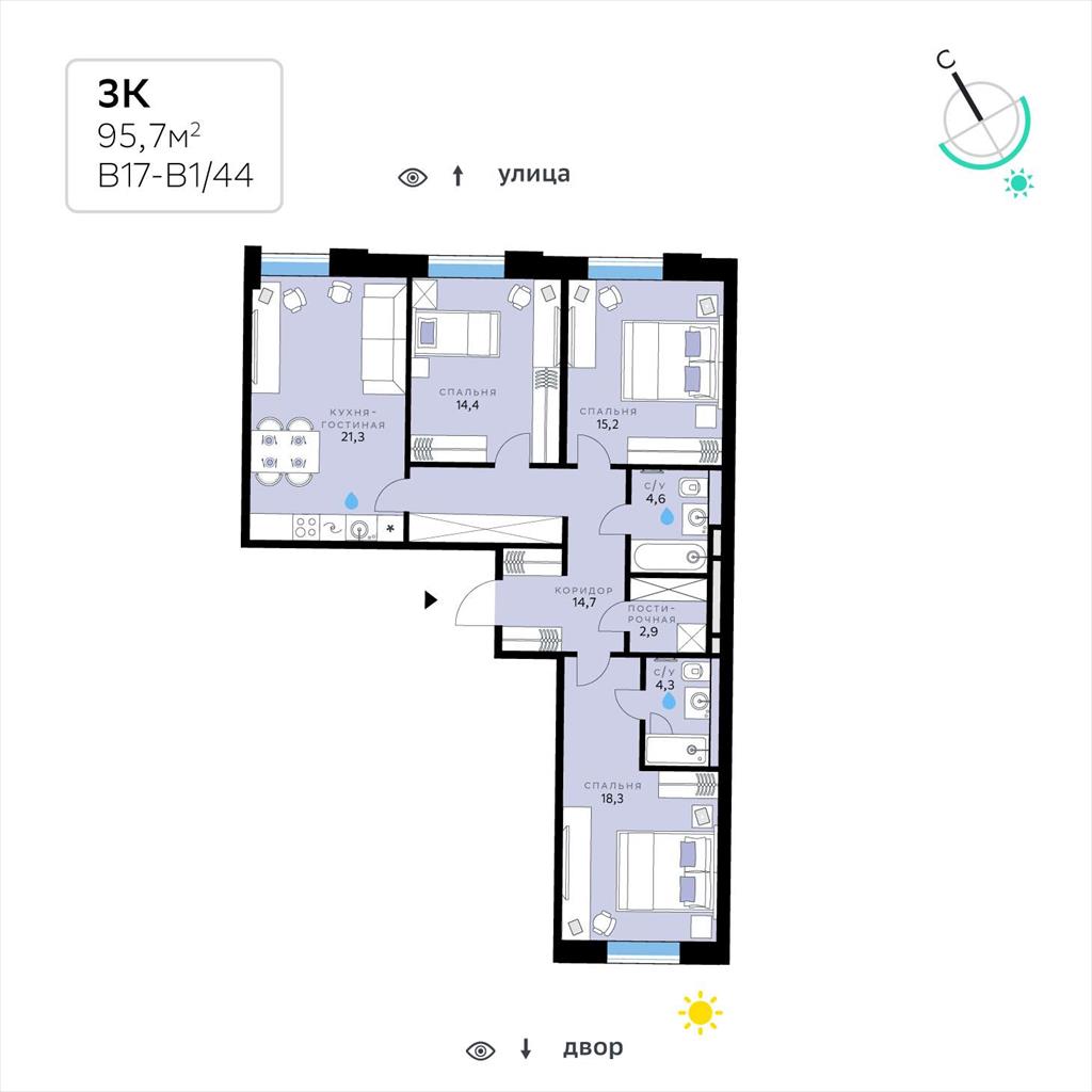 общая 95,7 м2, жилая 47,9 м2, кухни 21,3 м2 |