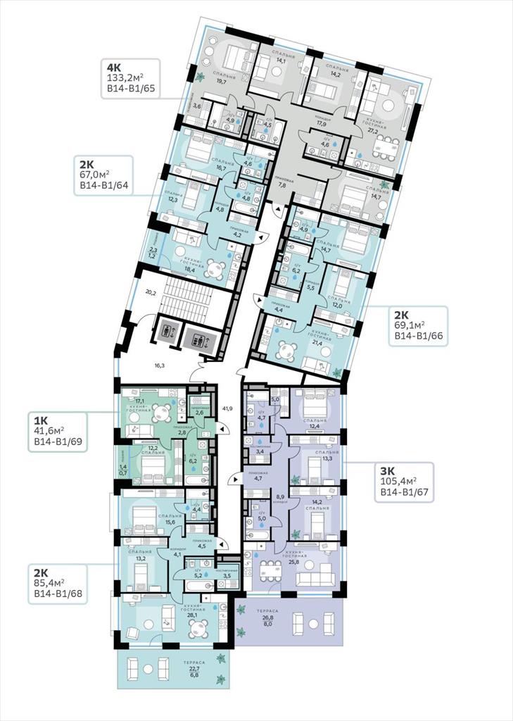 В архитектуре квартала, разработанной итальянским бюро, нашла отражение природная палитра. Для двух корпусов выбраны небесно-голубой и травянистый зелёный оттенки фасадов. Яркими акцентами служат декоративные металлические рамы окон и эркеров. Наслаждайтесь пейзажем и невероятными закатами из окон, встречайте рассветы на уютных лоджиях и балконах, устраивайте чаепития с соседями на общественных террасах. Выходите на пробежку или просто гуляйте рядом с кварталом: В14 примыкает к главному парку СберСити, а до набережной - 3 минуты пешком. В квартале - уютные дворы без машин с обилием крупномерных растений и кустарников, многолетних и сезонных цветов, детские площадки и тихие зоны отдыха.