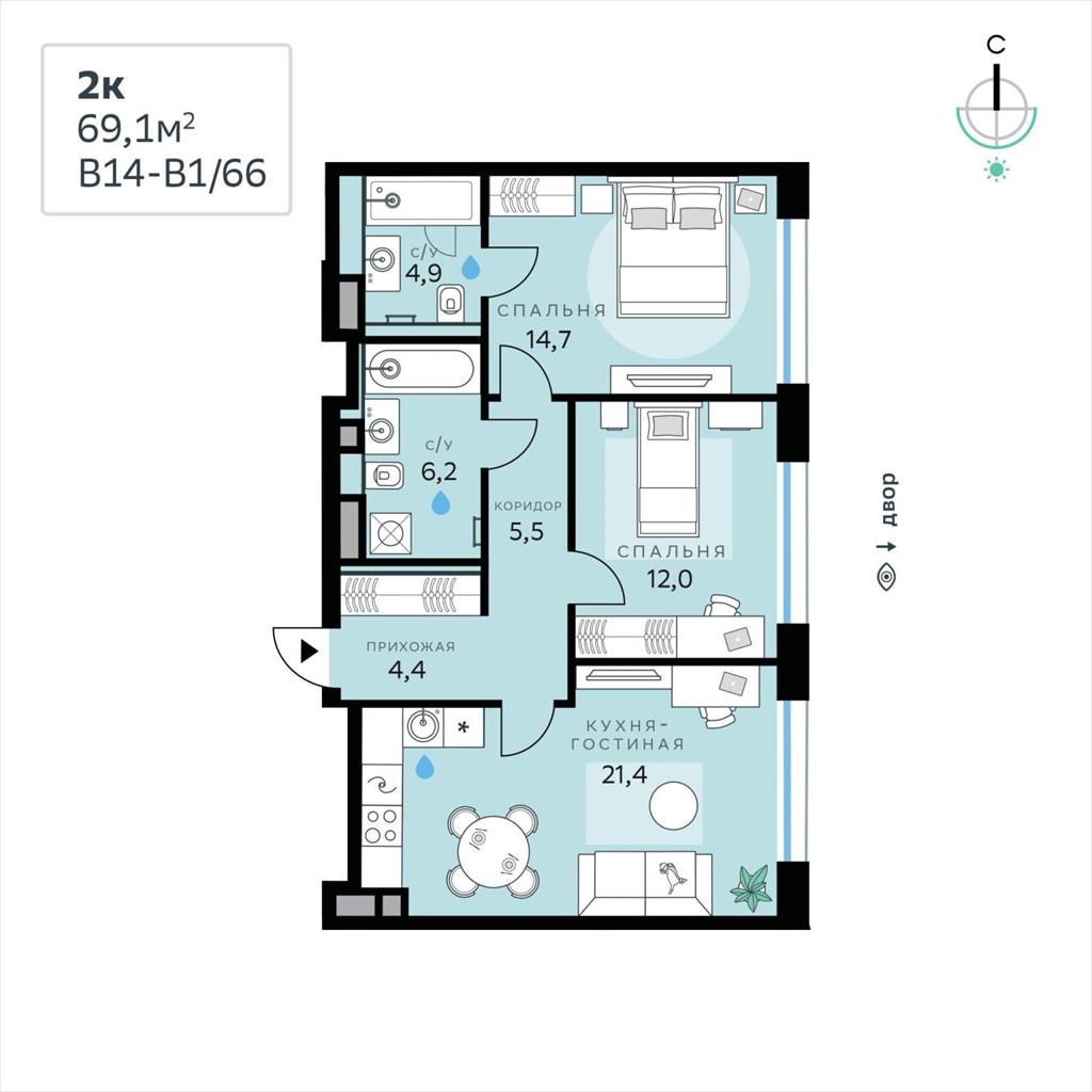 общая 69,1 м2, жилая 26,7 м2, кухни 21,4 м2 |