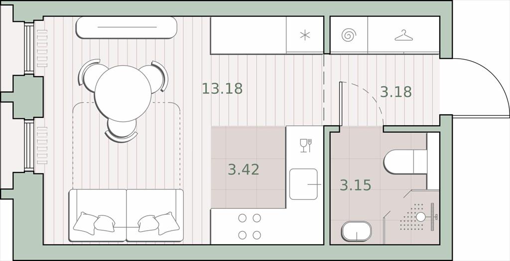 общая 22,93 м2, жилая 13,18 м2, кухни 3,42 м2 |