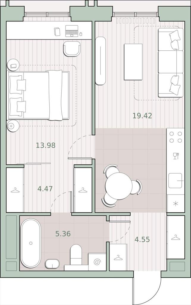 общая 47,78 м2, жилая 13,98 м2, кухни 19,42 м2 |