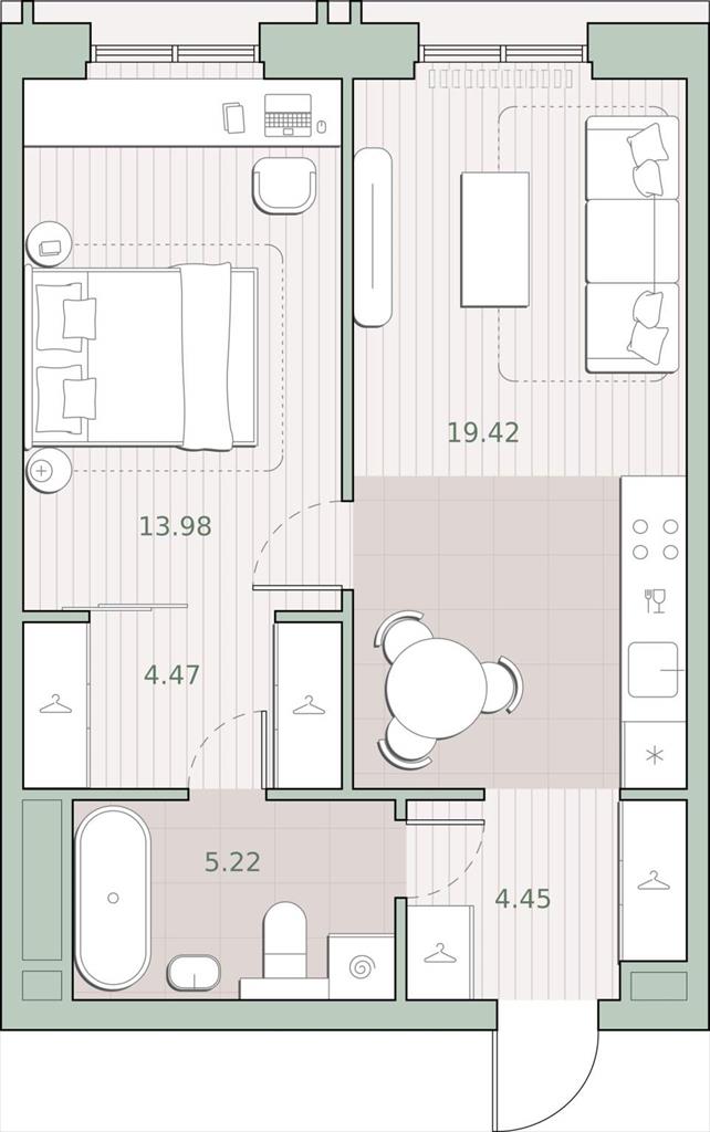общая 47,54 м2, жилая 13,98 м2, кухни 19,42 м2 |
