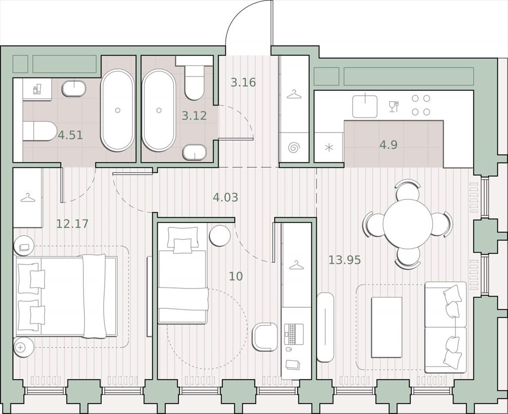 общая 55,84 м2, жилая 22,17 м2, кухни 4,9 м2 |