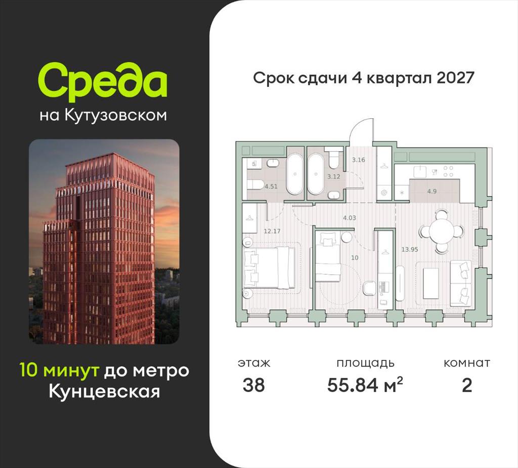 Продаётся 2-комнатная квартира общей площадью 55.84 кв.м. с отделкой white box. Квартира расположена на 38 этаже корпуса 4.1 в жилом комплексе бизнес-класса «Среда на Кутузовском» в пешей доступности от метро «Кунцевская».