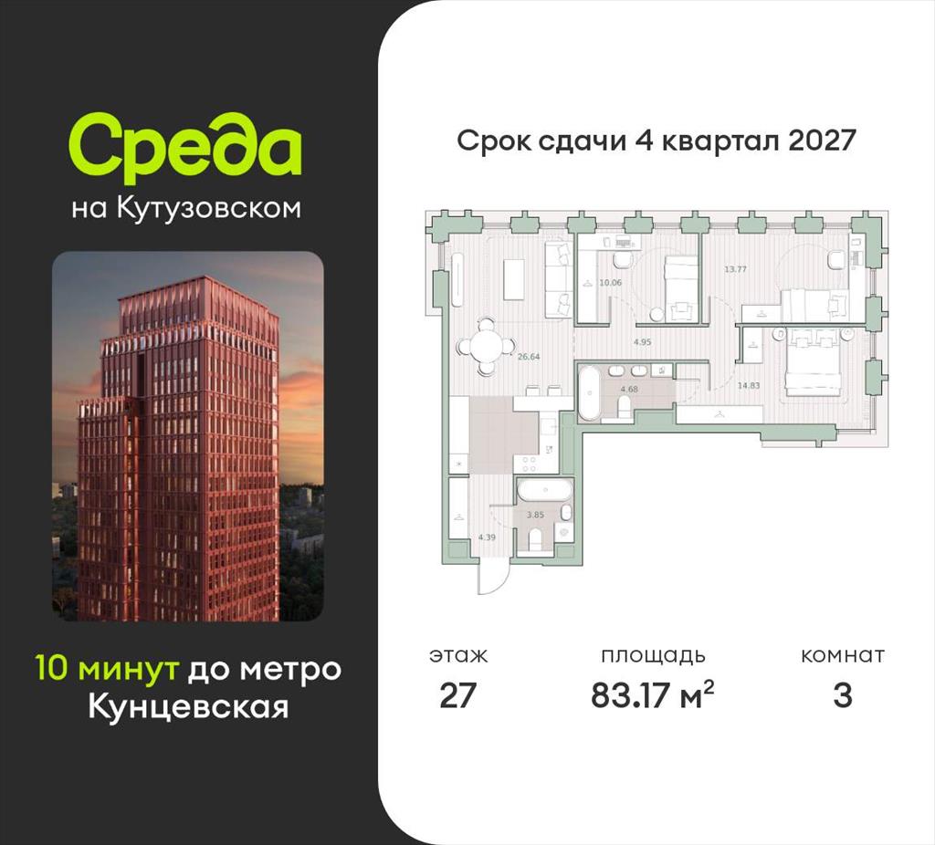 Продаётся 3-комнатная квартира общей площадью 83.17 кв.м. с отделкой white box. Квартира расположена на 27 этаже корпуса 4.1 в жилом комплексе бизнес-класса «Среда на Кутузовском» в пешей доступности от метро «Кунцевская».