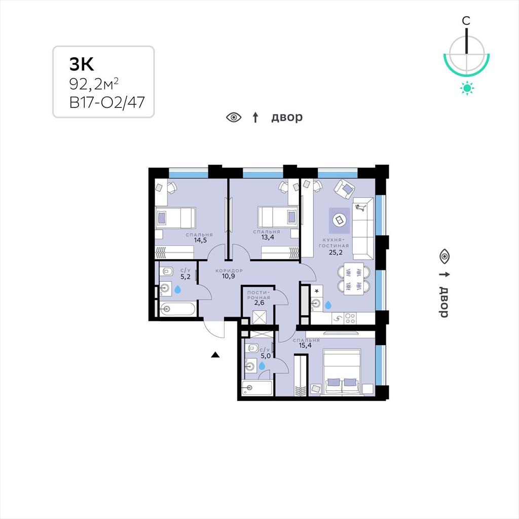 общая 92,2 м2, жилая 43,3 м2, кухни 25,2 м2 |