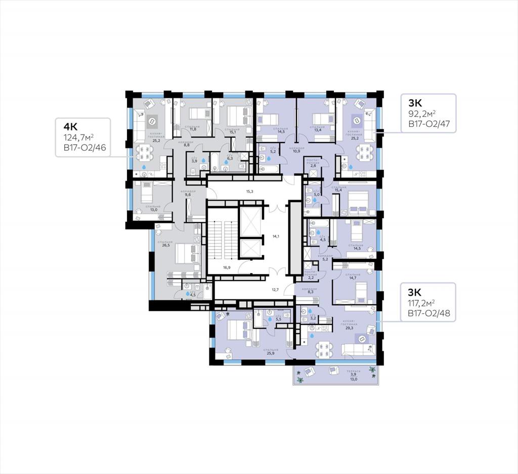 Квартал В17 состоит из шести корпусов переменной этажности (1, 2, 5-10 этажей), в которых размещается 491 квартира. Выдача ключей жителям запланирована на декабрь 2026 года. Корпуса объединены общей подземной частью, в которой располагается паркинг на 309 автомобилей, места для мотоциклов, а также более 400 кладовых для жильцов.