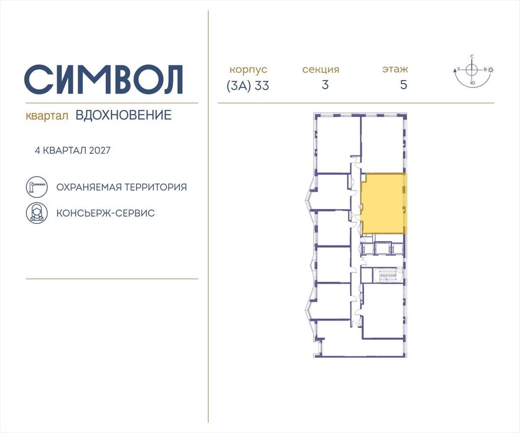 Квартира расположена в квартале Вдохновение, в корпусе 33 (секция 3). В каждом подъезде запроектировано 5 квартир на этаж, есть пассажирский и грузовой лифты.