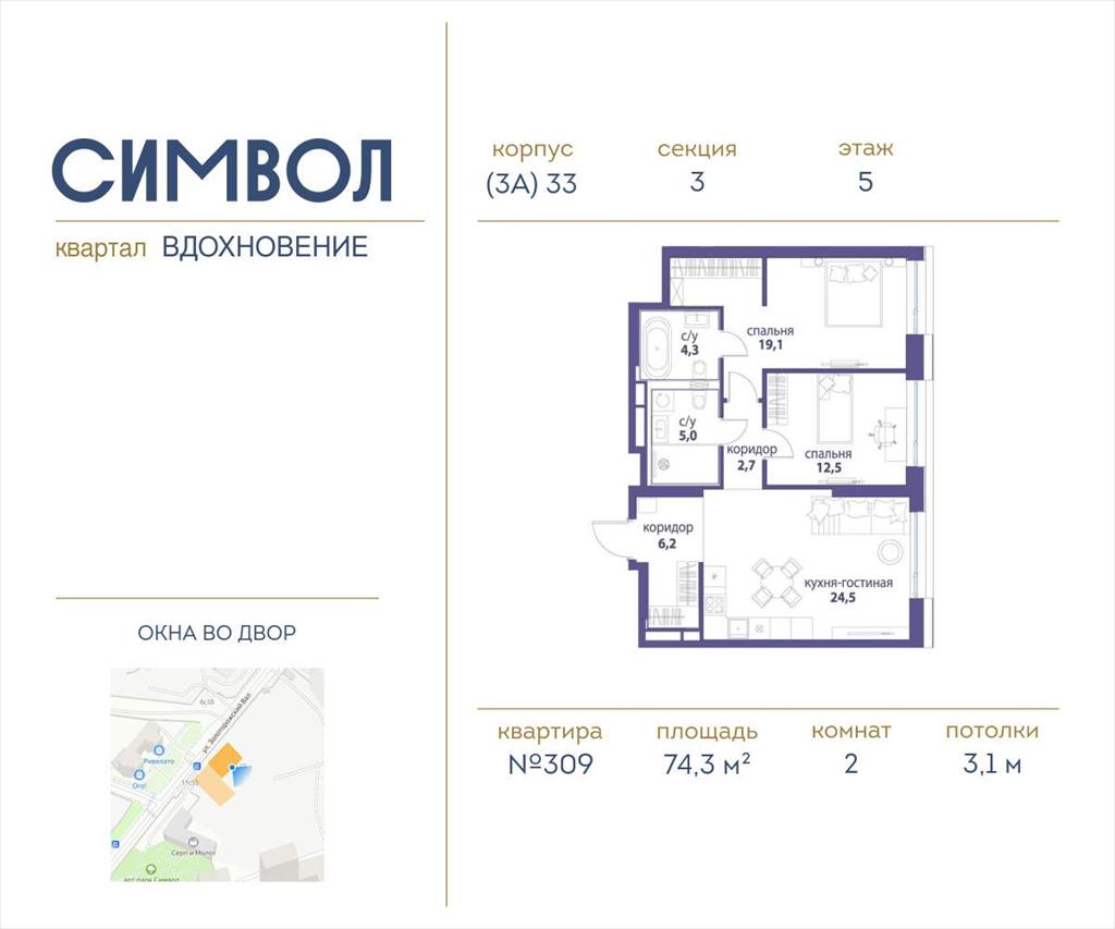 Продается 2-комн. квартира в ЖК «Символ» на 5-м этаже. Общая площадь лота составляет 74.30 кв. м, из которых 19.10 кв. м отведено под гостиную и 24.50 кв. м отведено под кухонную зону. 2 совмещенных санузла.