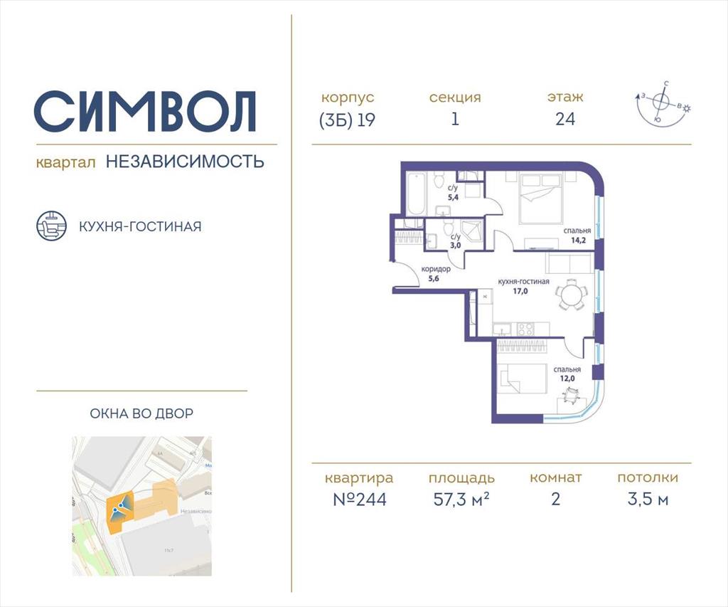 | Продается 2-комнатная квартира от застройщика: общая площадь 57.30 м, жилая 26.20 м, кухня 17.00 м, 24-й этаж, жилой квартал «Независимость», корпус 19 (секция 1) . Срок сдачи: 3 квартал 2025 года.