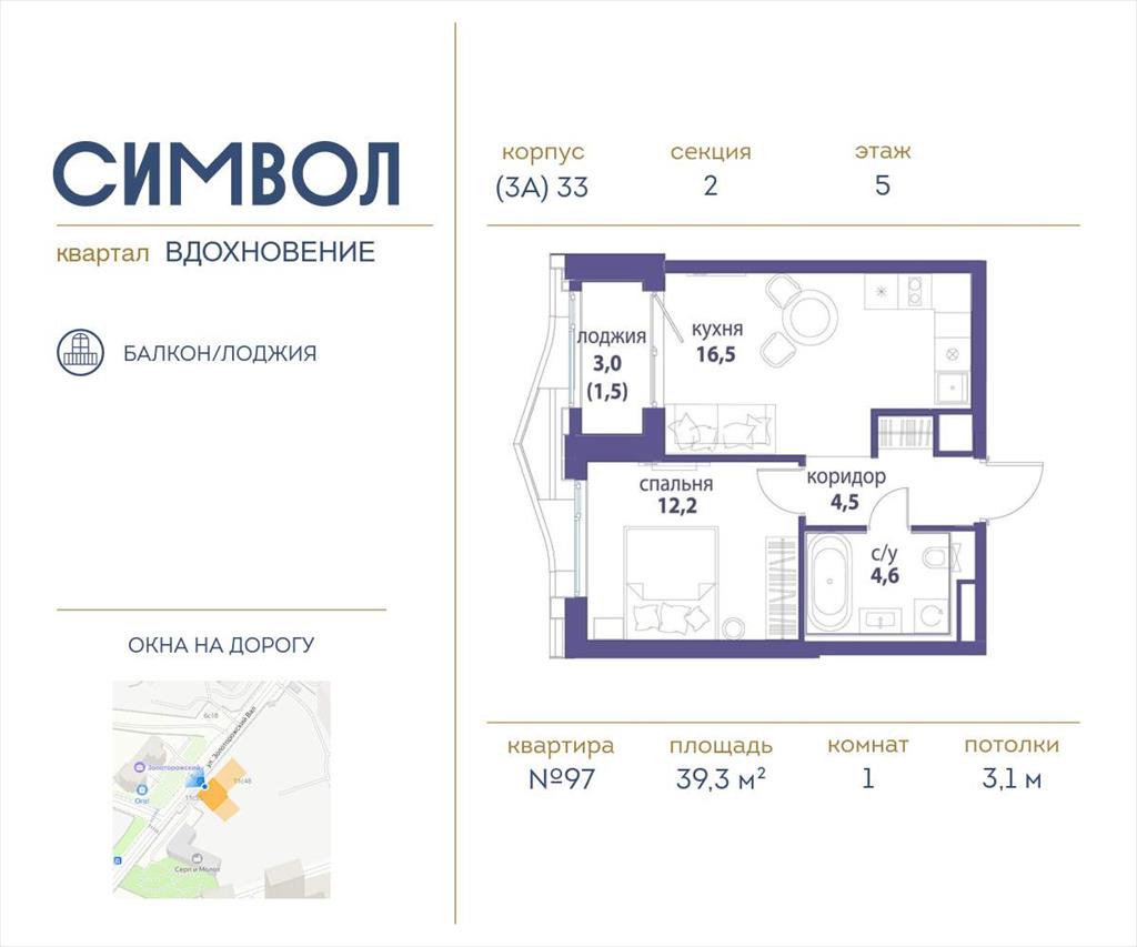 | Продается 1-комнатная квартира от застройщика: общая площадь 39.30 м, жилая 12.20 м, кухня 16.50 м, 5-й этаж, жилой квартал «Вдохновение», корпус 33 (секция 2) . Срок сдачи: 4 квартал 2027 года.