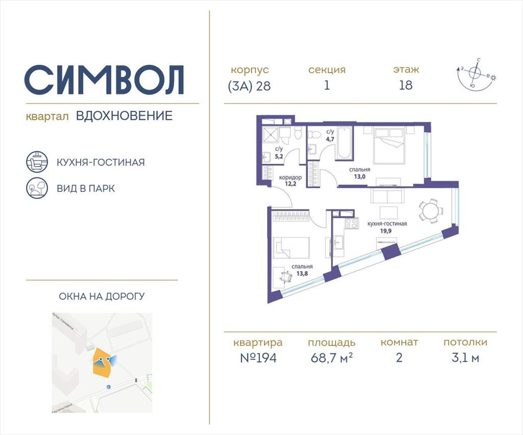 | Продается 2-комнатная квартира от застройщика: общая площадь 68.70 м, жилая 26.80 м, кухня 19.90 м, 18-й этаж, жилой квартал «Вдохновение», корпус 28 (секция 1) . Срок сдачи: 3 квартал 2025 года.