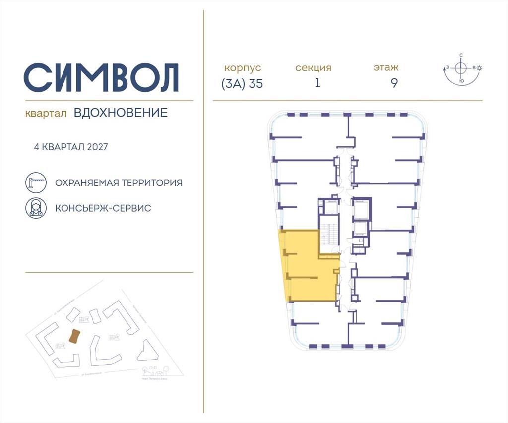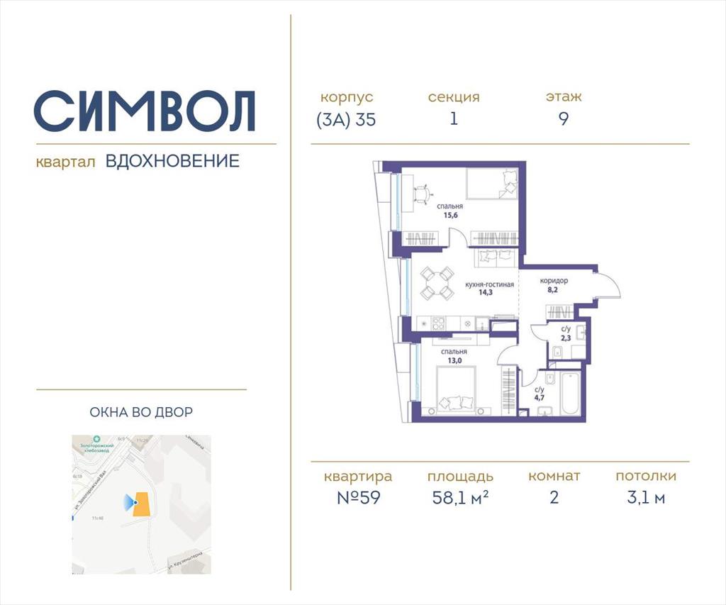 | Продается 2-комнатная квартира от застройщика: общая площадь 58.10 м, жилая 28.60 м, кухня 14.30 м, 9-й этаж, жилой квартал «Вдохновение», корпус 35 (секция 1) . Срок сдачи: 4 квартал 2027 года.