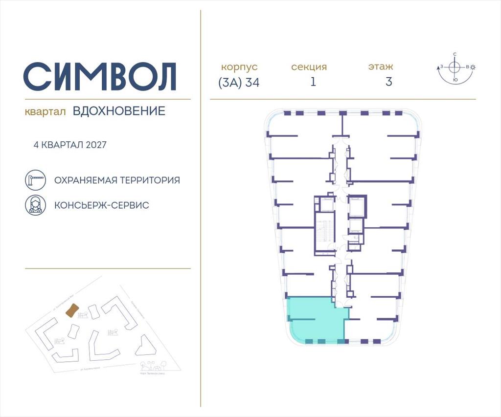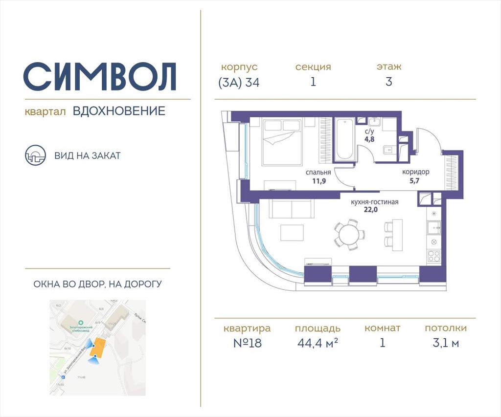 | Продается 1-комнатная квартира от застройщика: общая площадь 44.40 м, жилая 11.90 м, кухня 22.00 м, 3-й этаж, жилой квартал «Вдохновение», корпус 34 (секция 1) . Срок сдачи: 4 квартал 2027 года.