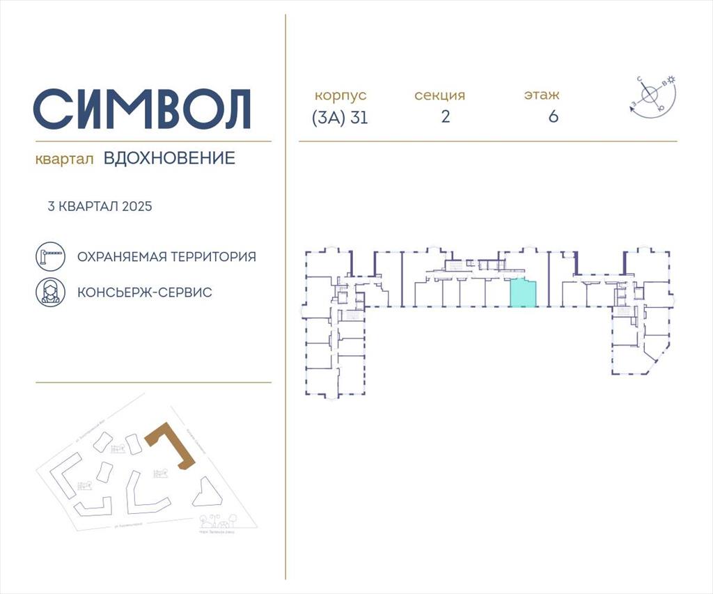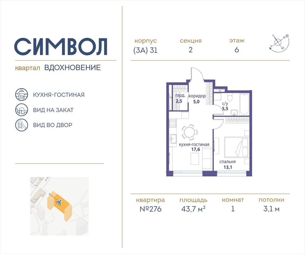 | Продается 1-комнатная квартира от застройщика: общая площадь 43.70 м, жилая 13.10 м, кухня 17.60 м, 6-й этаж, жилой квартал «Вдохновение», корпус 31 (секция 2) . Срок сдачи: 3 квартал 2025 года.