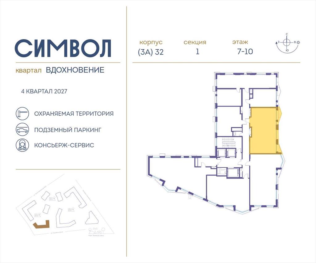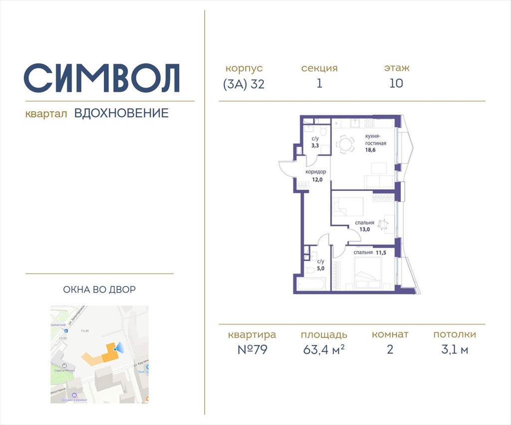 | Продается 2-комнатная квартира от застройщика: общая площадь 63.40 м, жилая 24.50 м, кухня 18.60 м, 10-й этаж, жилой квартал «Вдохновение», корпус 32 (секция 1) . Срок сдачи: 4 квартал 2027 года.