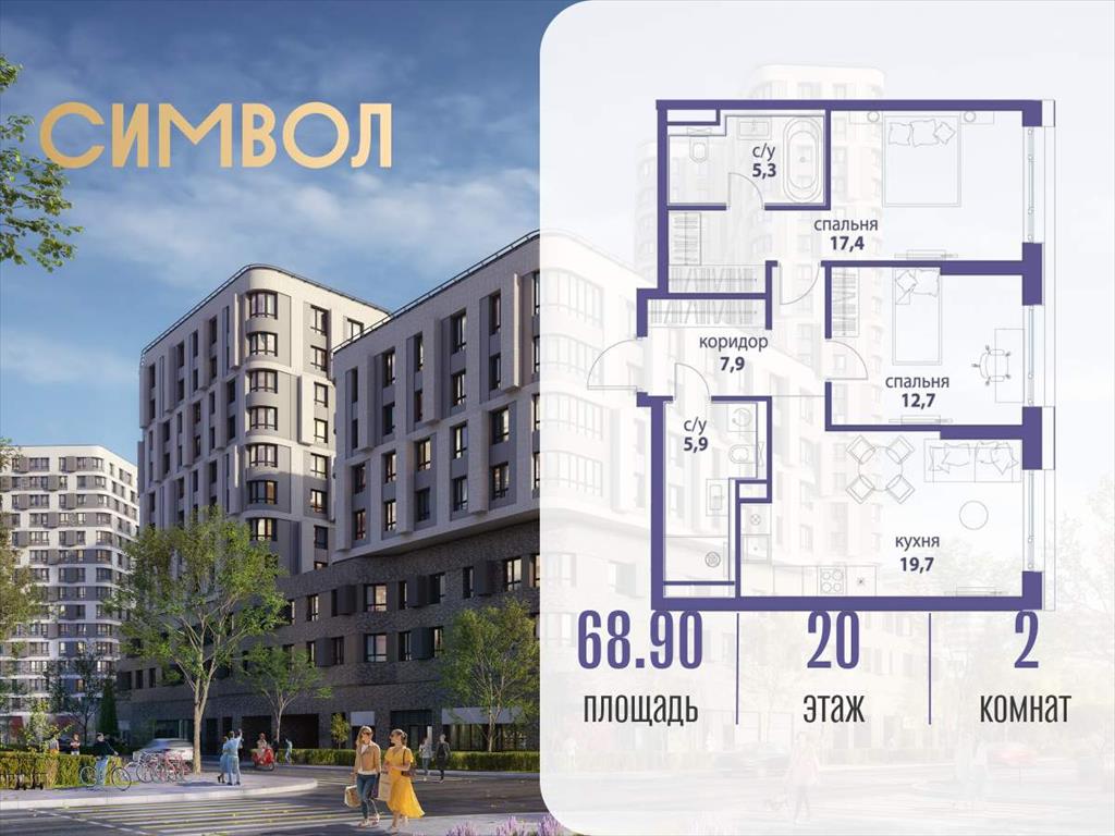 | Продается 2-комнатная квартира от застройщика: общая площадь 68.90 м, жилая 30.10 м, кухня 19.70 м, 20-й этаж, жилой квартал «Вдохновение», корпус 33 (секция 3) . Срок сдачи: 4 квартал 2027 года.