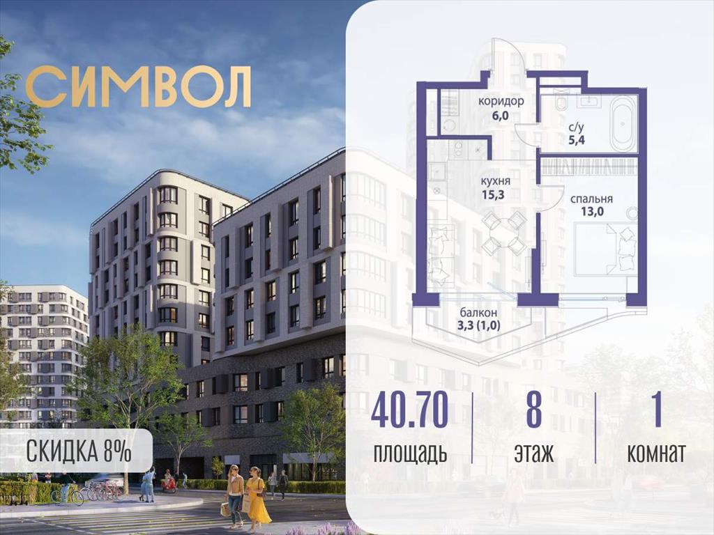 | Продается 1-комнатная квартира от застройщика: общая площадь 40.70 м, жилая 13.00 м, кухня 15.30 м, 8-й этаж, жилой квартал «Вдохновение», корпус 33 (секция 2) . Срок сдачи: 4 квартал 2027 года.