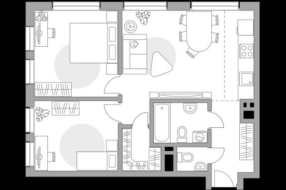 Жилая площадь 43.79 м2, кухня 5.01 м2. Площадь комнат: 18.69/13.69/11.41 м2, квартира без отделки, окна выходят на улицу.