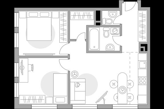 Жилая площадь 43.76 м2, кухня 5.01 м2. Площадь комнат: 18.44/12.84/12.48 м2, квартира без отделки, окна выходят во двор.