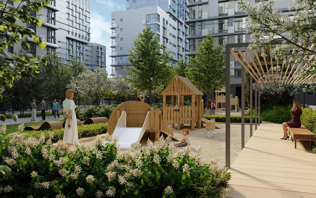 - Приватный двор с многоуровневым ландшафтным парком, детскими площадками, зонами для отдыха и арт-объектами