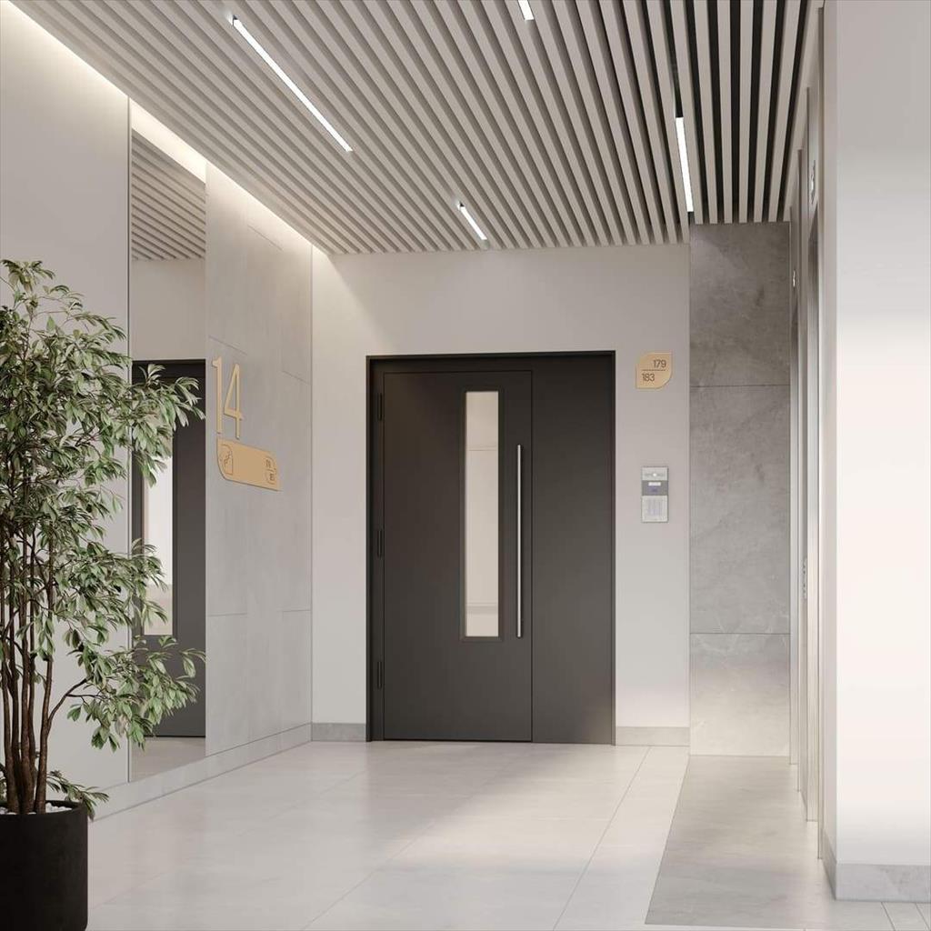 - В каждом лобби спроектированы общественный санузел, мягкая зона для комфортного ожидания курьера или такси, предусмотрены отдельные помещения для хранения колясок, велосипедов и самокатов, а также помещения для мойки лап собакам