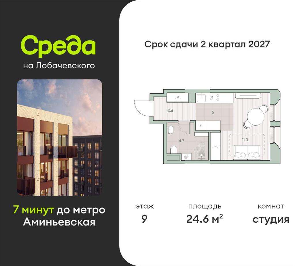 Продаётся студия общей площадью 24.6 кв.м. с отделкой white box. Квартира расположена на 9 этаже корпуса 5.2 в жилом комплексе бизнес-класса «Среда на Лобачевского» в пешей доступности от метро «Аминьевская».