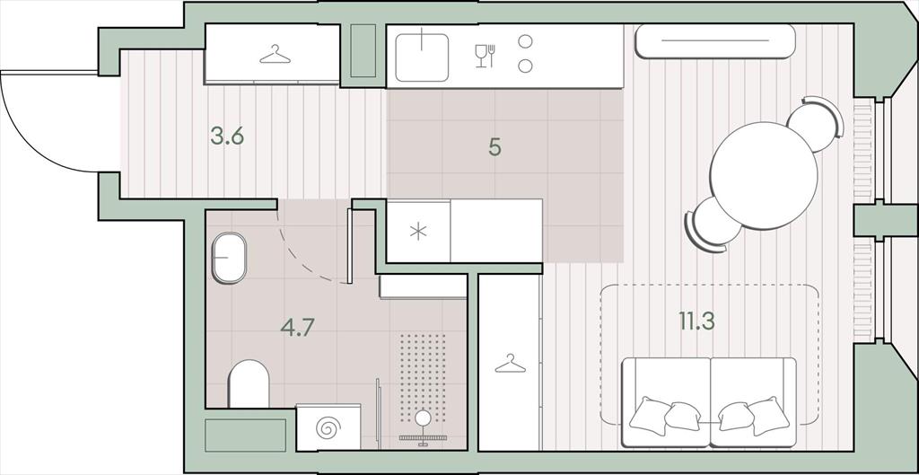 общая 24,6 м2, жилая 11,3 м2, кухни 5 м2 |