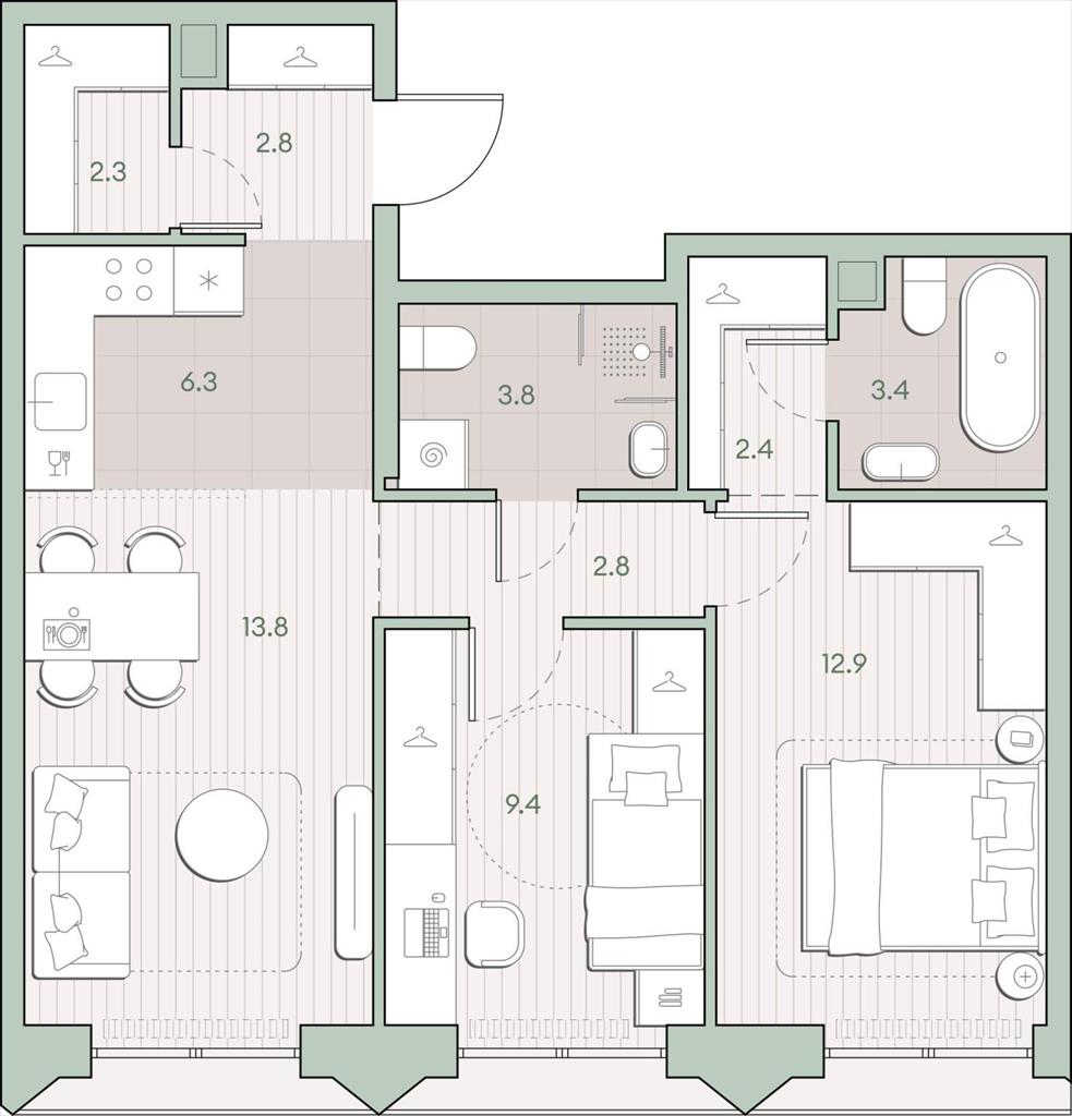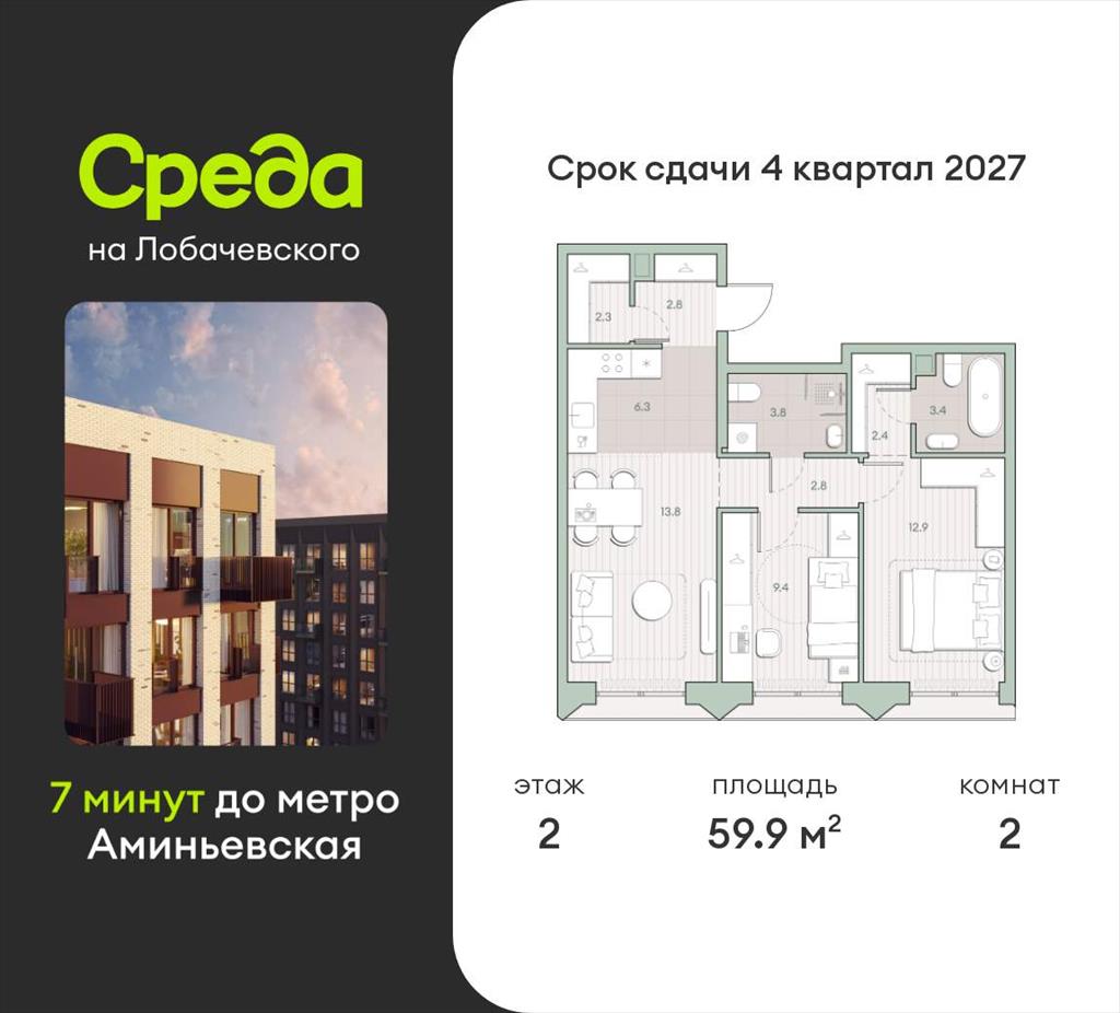 Продаётся 2-комнатная квартира общей площадью 59.9 кв.м. без отделки. Квартира расположена на 2 этаже корпуса 5.7 в жилом комплексе бизнес-класса «Среда на Лобачевского» в пешей доступности от метро «Аминьевская».
