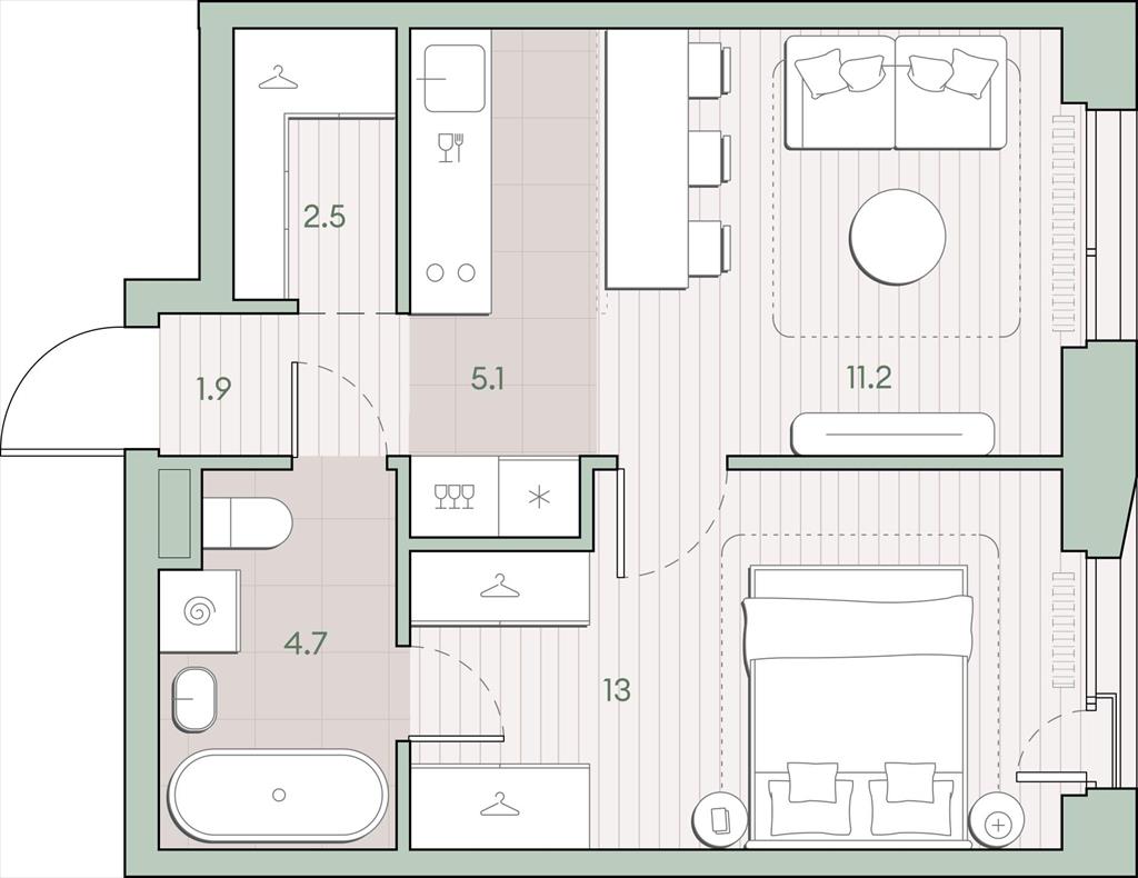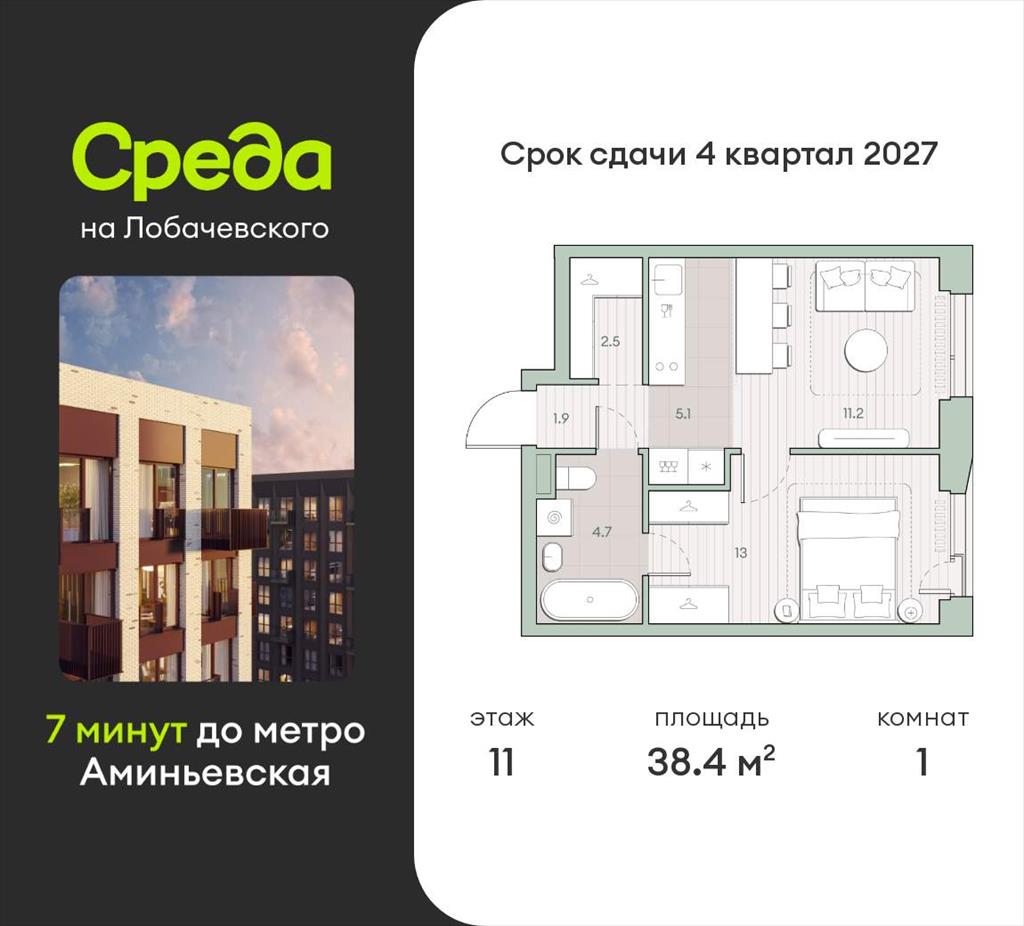 Продаётся 1-комнатная квартира общей площадью 38.4 кв.м. без отделки. Квартира расположена на 11 этаже корпуса 5.5 в жилом комплексе бизнес-класса «Среда на Лобачевского» в пешей доступности от метро «Аминьевская».