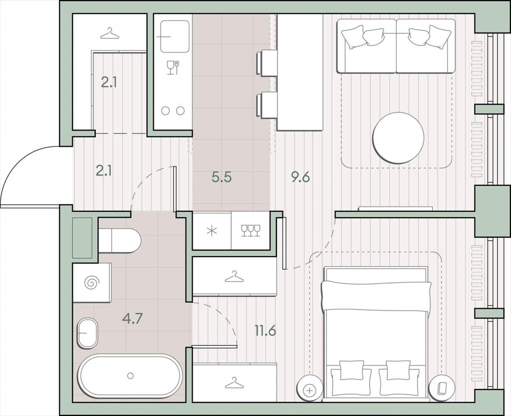 общая 35,6 м2, жилая 21,2 м2, кухни 5,5 м2 |