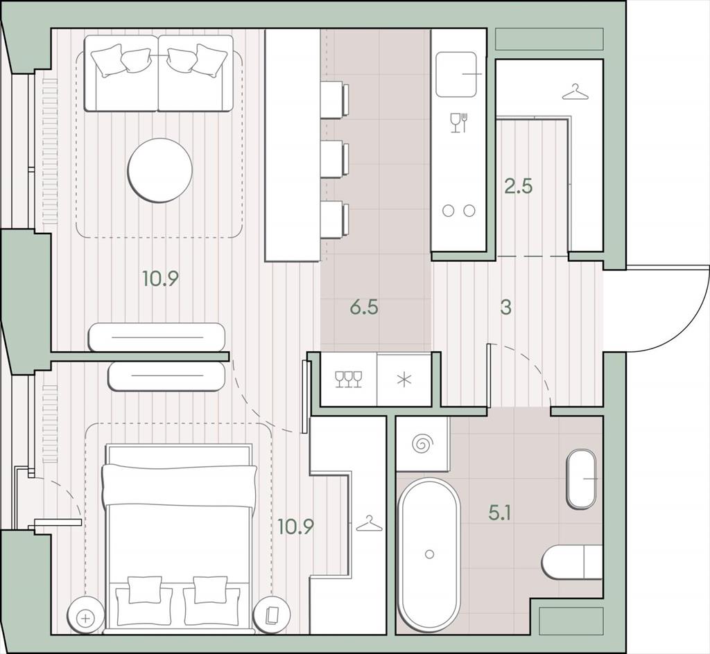 общая 38,9 м2, жилая 21,8 м2, кухни 6,5 м2 |