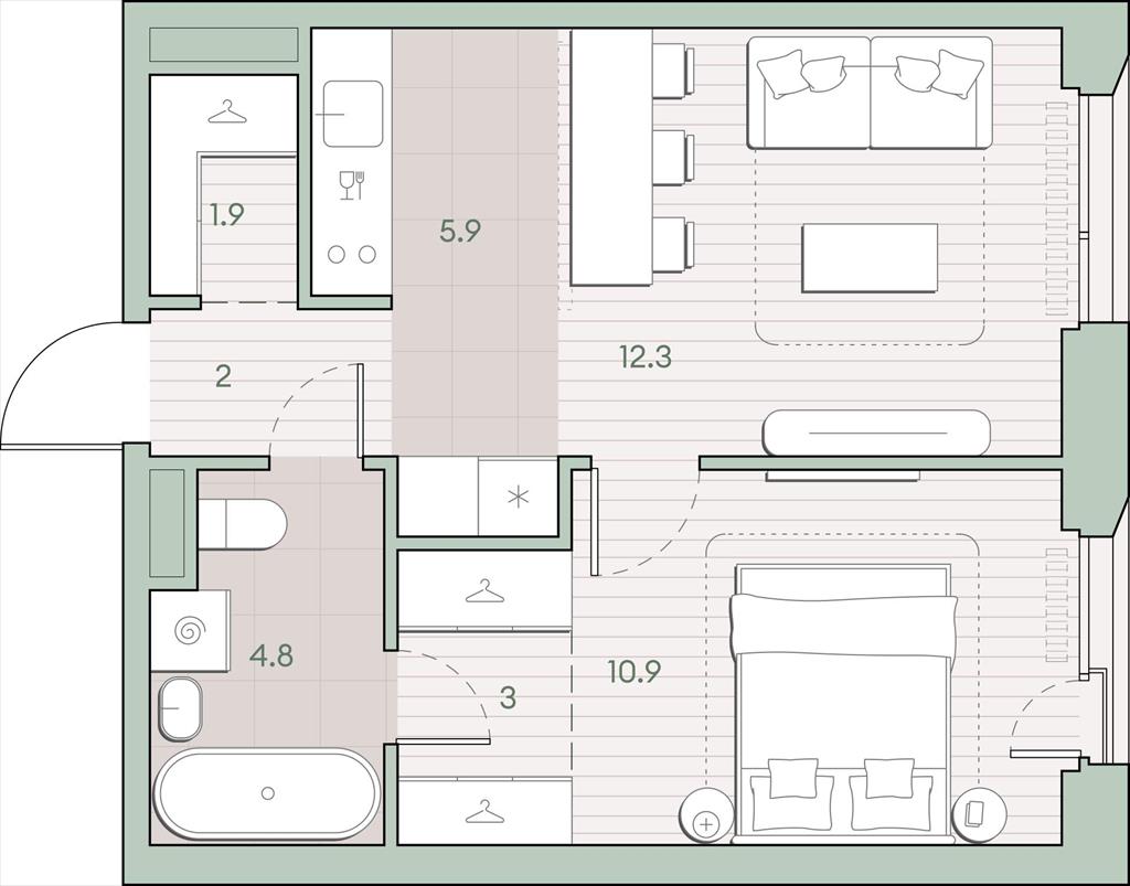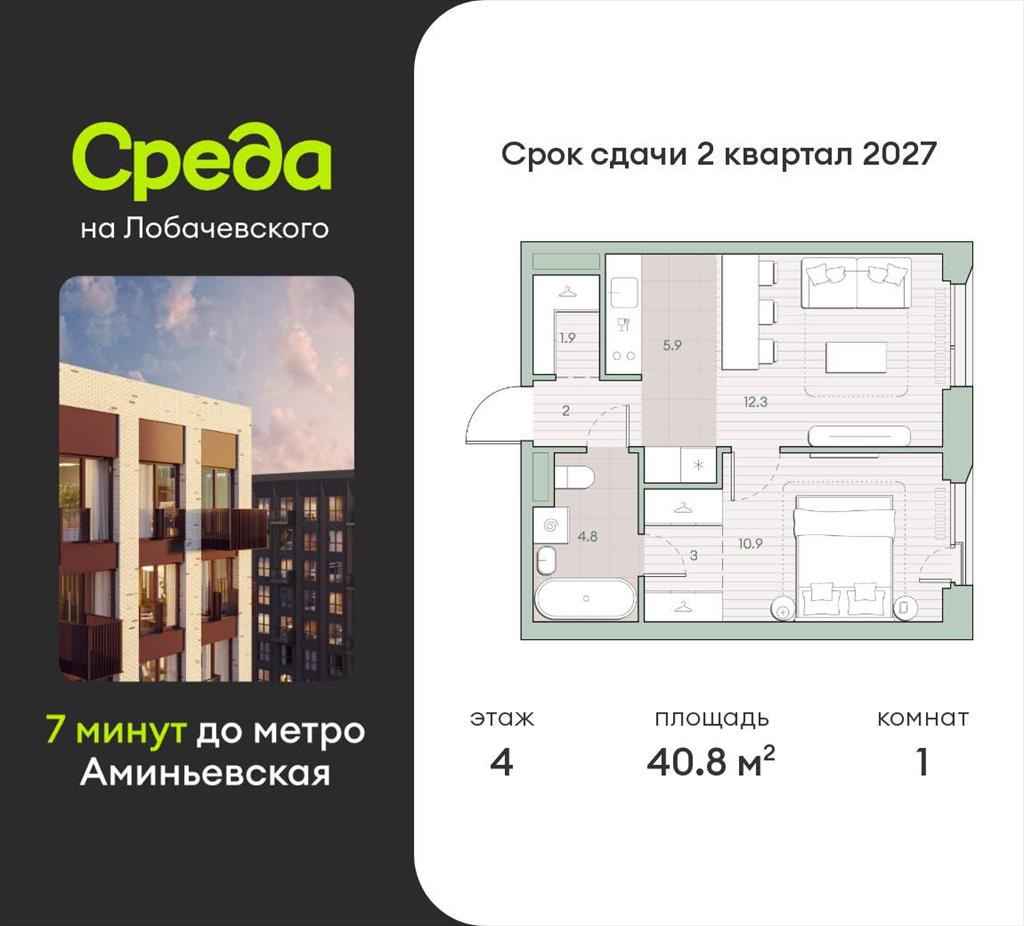 Продаётся 1-комнатная квартира общей площадью 40.8 кв.м. с отделкой white box. Квартира расположена на 4 этаже секции 5.4. 1 в жилом комплексе бизнес-класса «Среда на Лобачевского» в пешей доступности от метро «Аминьевская».