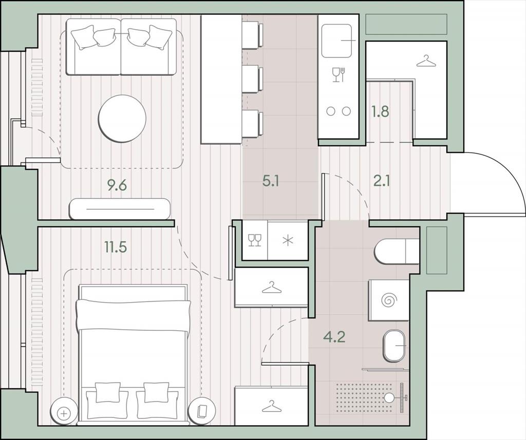 общая 34,3 м2, жилая 21,1 м2, кухни 5,1 м2 |