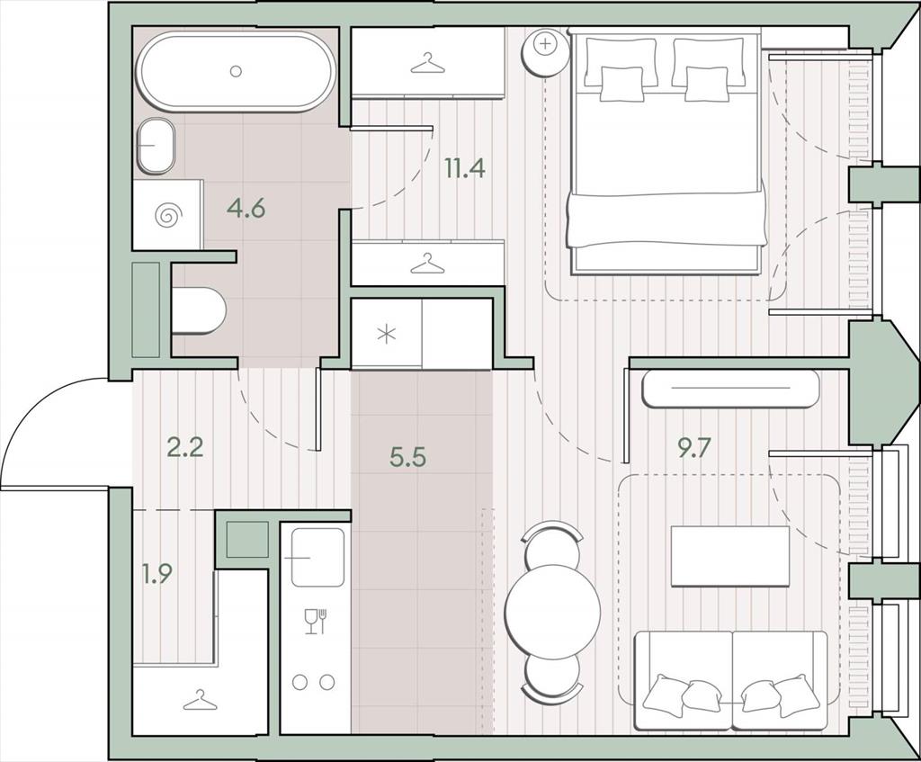 общая 35,3 м2, жилая 21,1 м2, кухни 5,5 м2 |