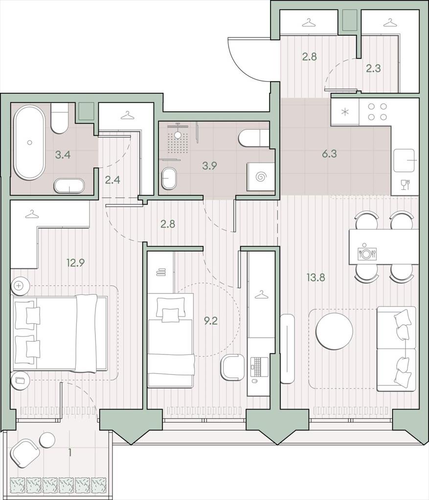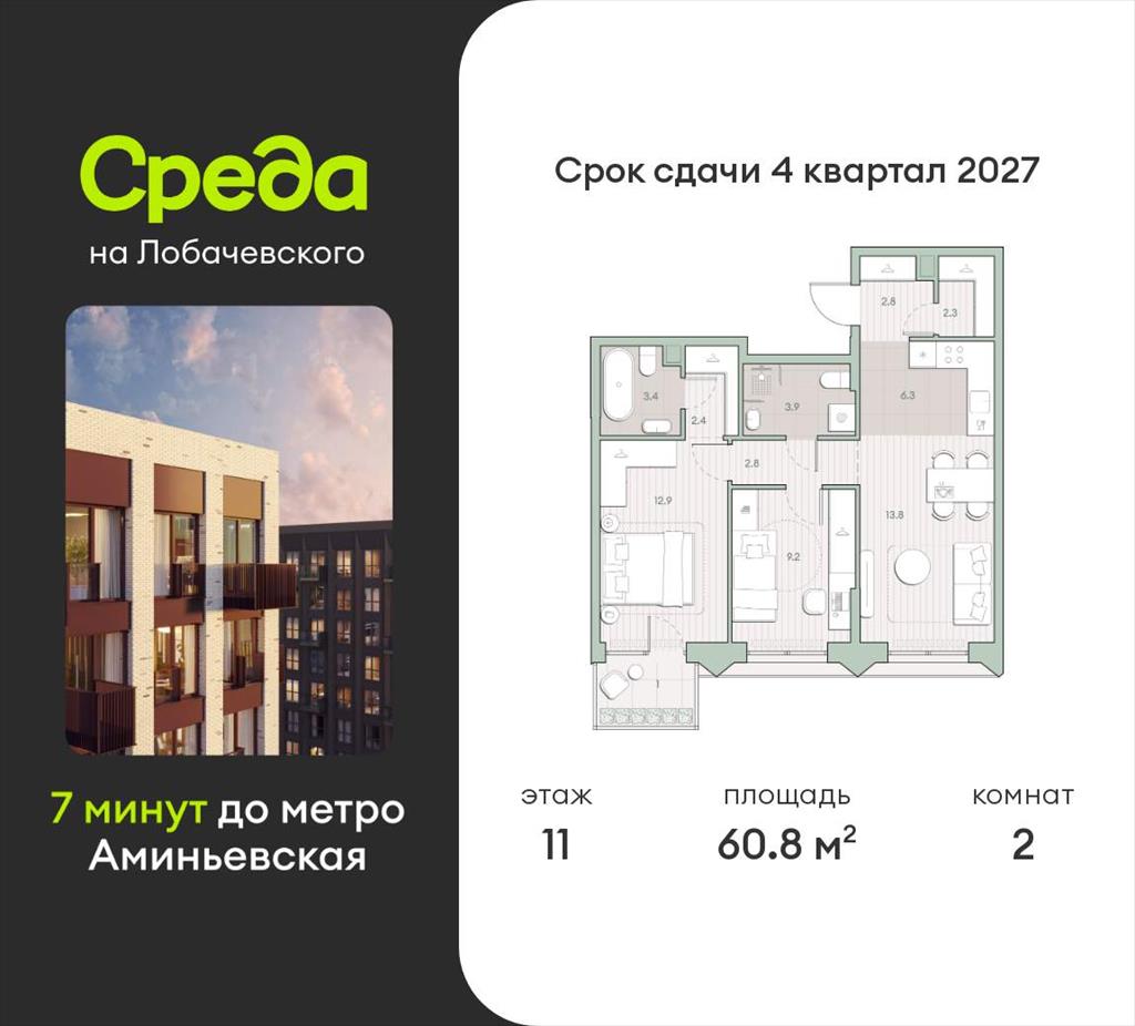 Продаётся 2-комнатная квартира общей площадью 60.8 кв.м. без отделки. Квартира расположена на 11 этаже корпуса 5.7 в жилом комплексе бизнес-класса «Среда на Лобачевского» в пешей доступности от метро «Аминьевская».