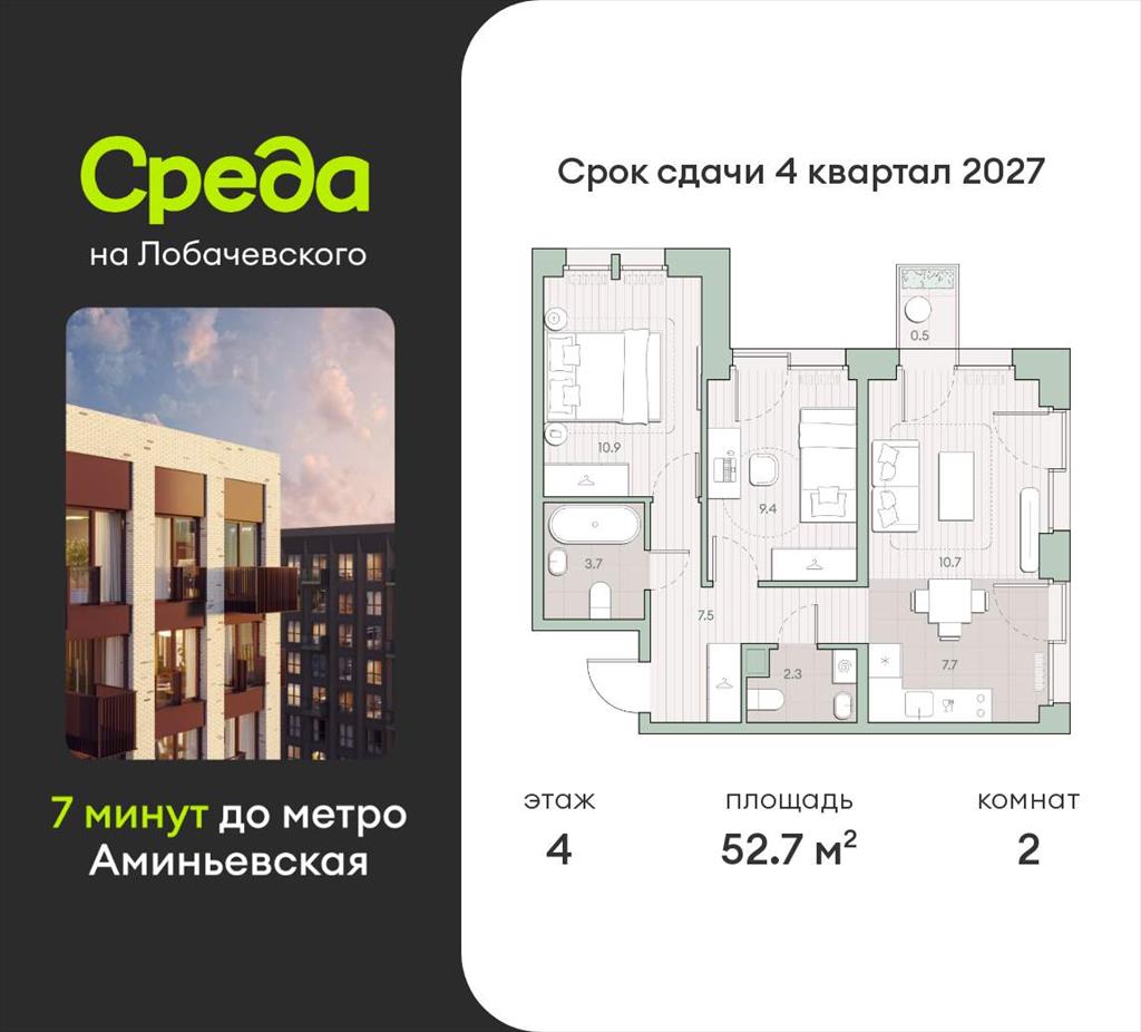 Продаётся 2-комнатная квартира общей площадью 52.7 кв.м. без отделки. Квартира расположена на 4 этаже корпуса 5.8 в жилом комплексе бизнес-класса «Среда на Лобачевского» в пешей доступности от метро «Аминьевская».