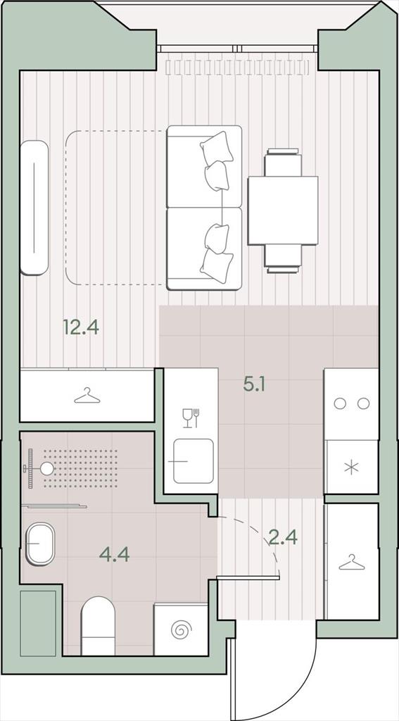 общая 24,3 м2, жилая 12,4 м2, кухни 5,1 м2 |
