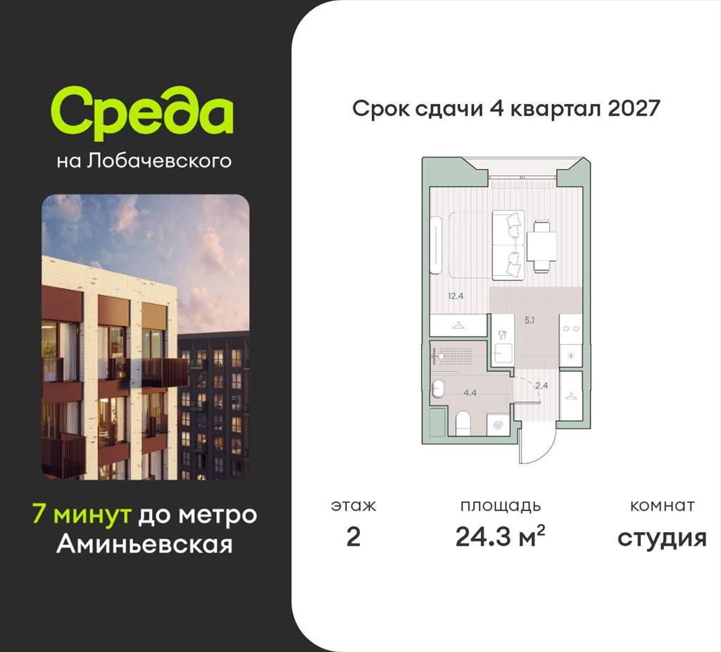 Продаётся студия общей площадью 24.3 кв.м. без отделки. Квартира расположена на 2 этаже корпуса 5.7 в жилом комплексе бизнес-класса «Среда на Лобачевского» в пешей доступности от метро «Аминьевская».
