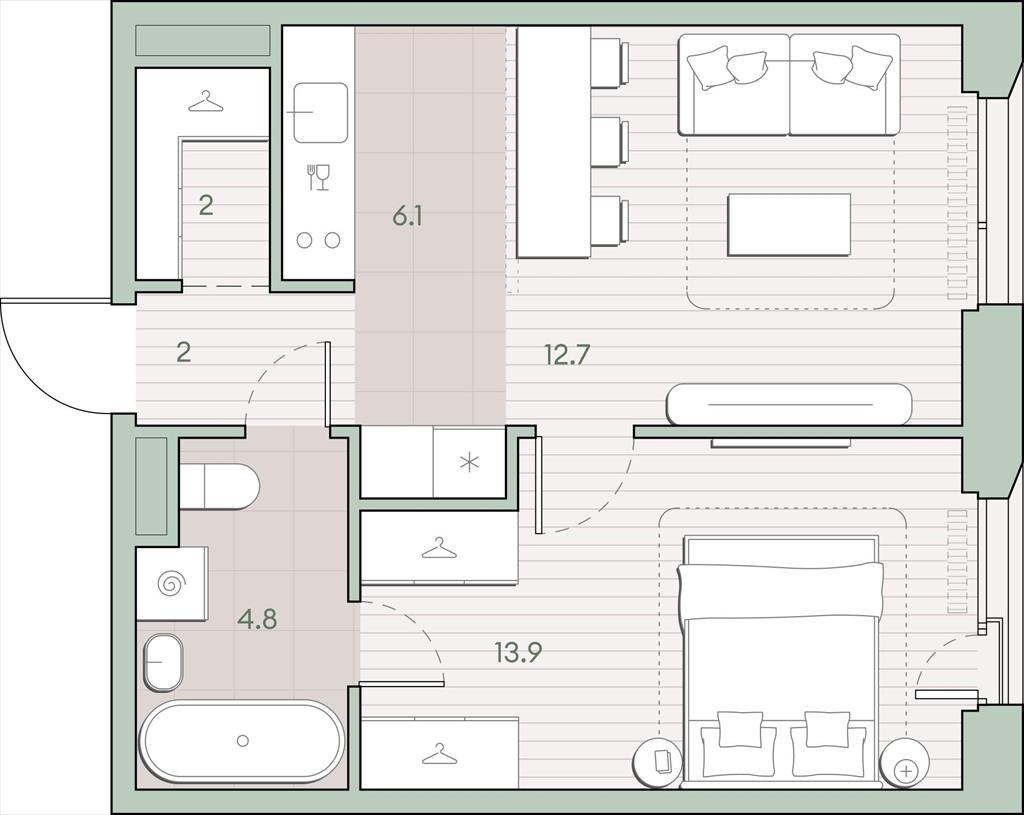 общая 41,5 м2, жилая 26,6 м2, кухни 6,1 м2 |