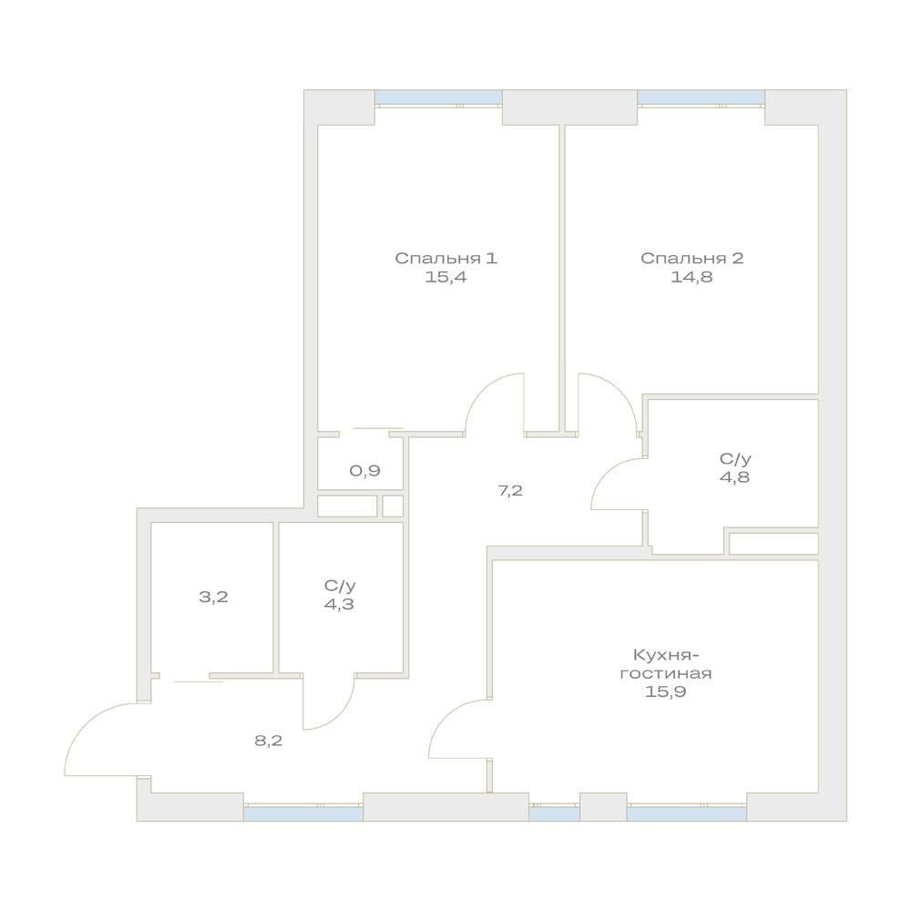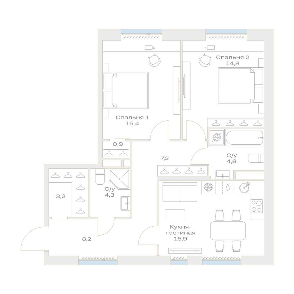 общая 74,7 м2, жилая 30,2 м2, кухни 15,9 м2 |