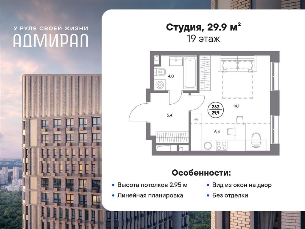 общая 29,9 м2, жилая 14,1 м2, кухни 6,4 м2 |