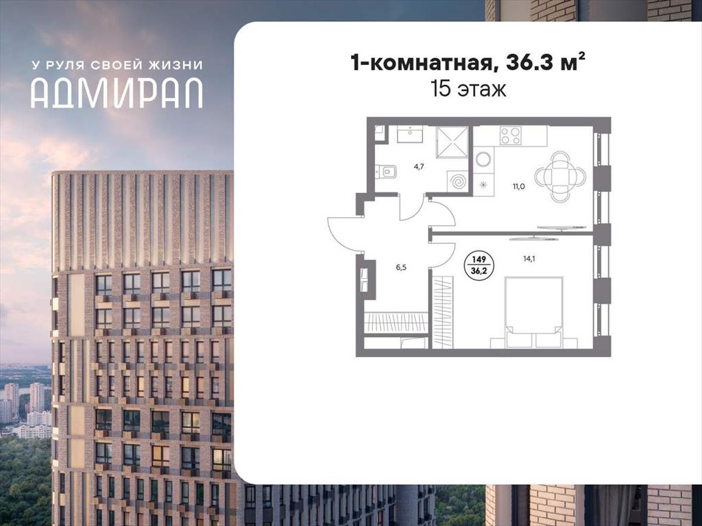 общая 36,3 м2, жилая 14,1 м2, кухни 11 м2 |