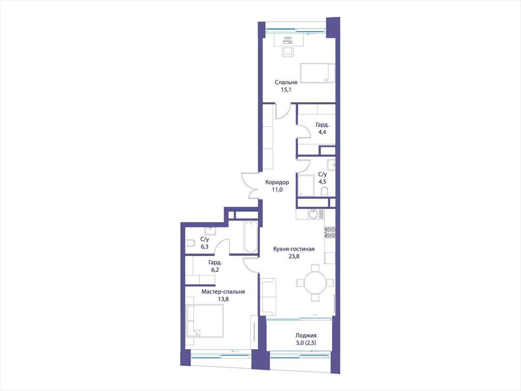 В квартире продуманная функциональная планировка с просторной кухней 23.80 м2. Жилая площадь - 28.90 м2. Высота потолка от 3,65 м. Изолированные комнаты, 2 совмещенных санузла. Окна на смежные стороны. Виды на природный парк и реку.
