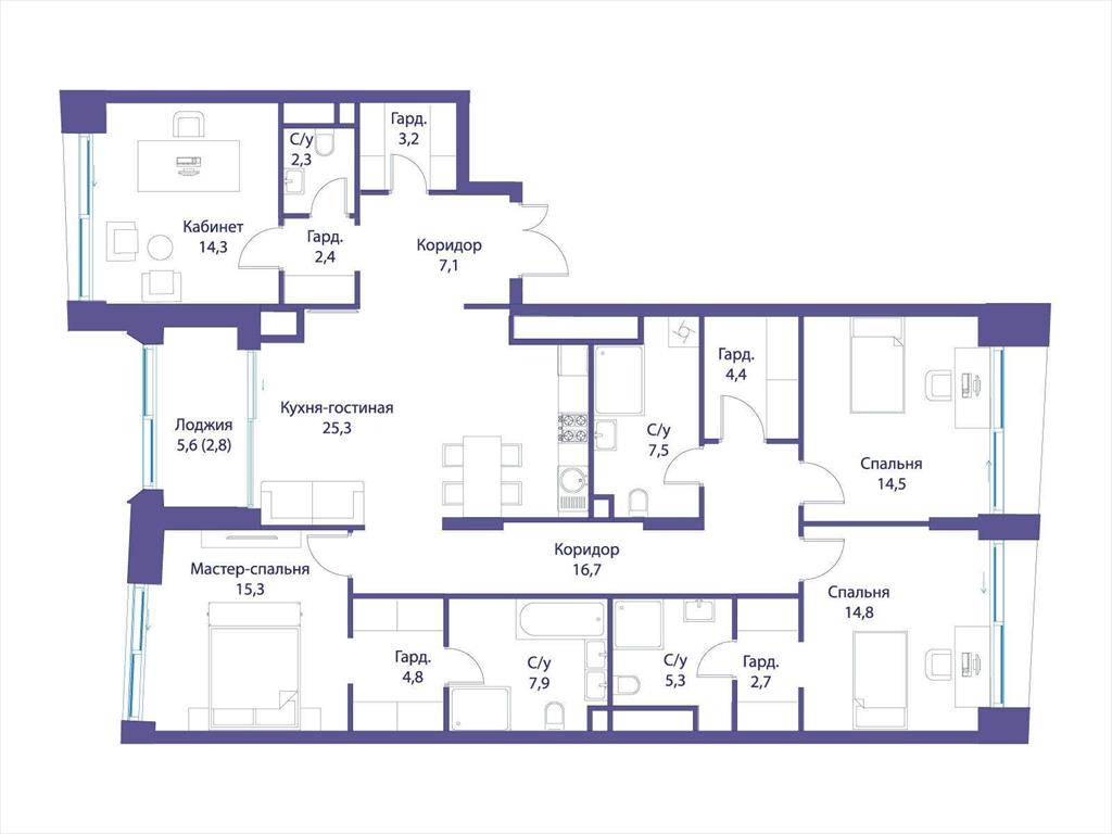 В квартире продуманная функциональная планировка с просторной кухней 25.30 м2. Жилая площадь - 58.90 м2. Высота потолка от 3,65 м. Изолированные комнаты, 4 санузла(1 раздельный и 3 совмещенных) . Окна на смежные стороны. Виды на природный парк и реку.