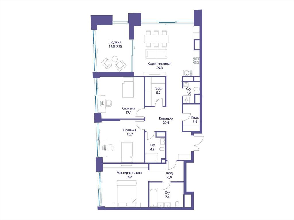 общая 140,1 м2, жилая 52,6 м2, кухни 29,8 м2 |