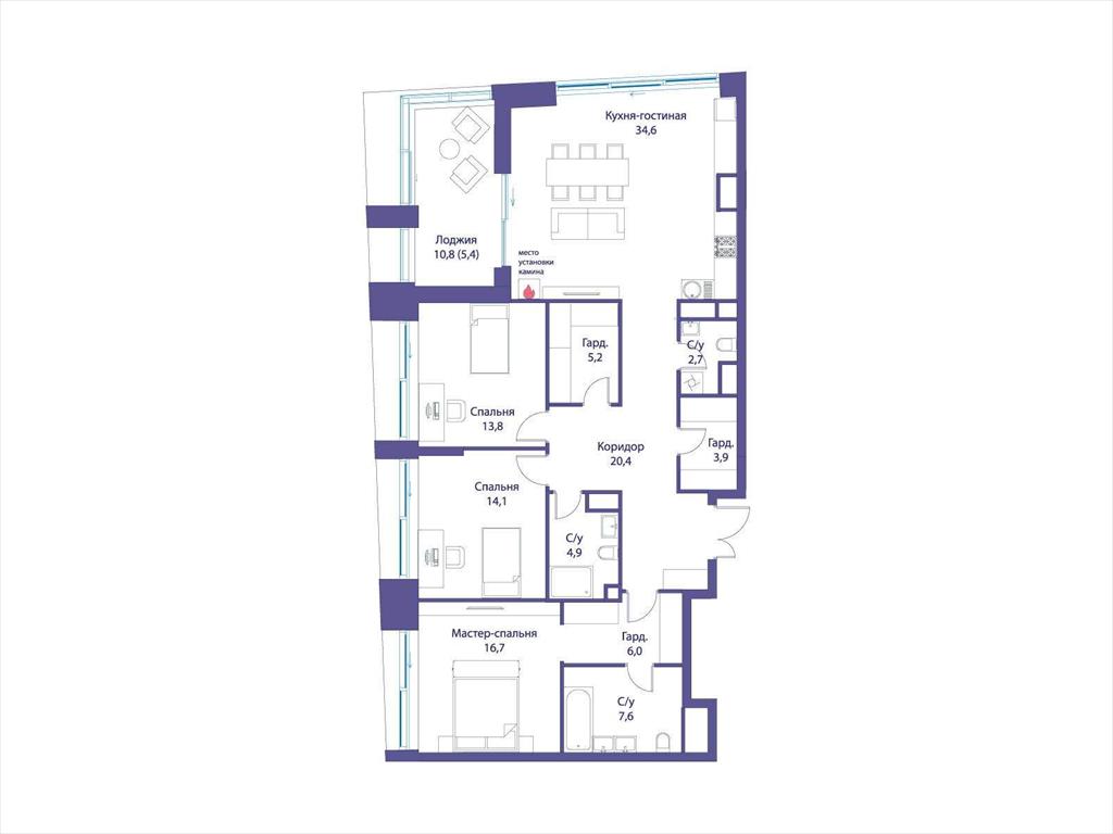 В квартире продуманная функциональная планировка с просторной кухней 34.60 м2. Жилая площадь - 44.60 м2. Высота потолка от 3,65 м. Изолированные комнаты, 3 санузла(1 раздельный и 2 совмещенных) . Окна на противоположные стороны. Виды на природный парк и реку.